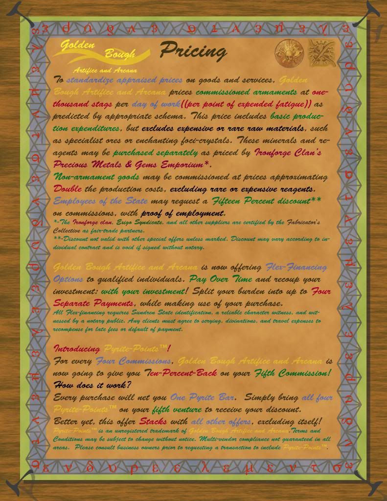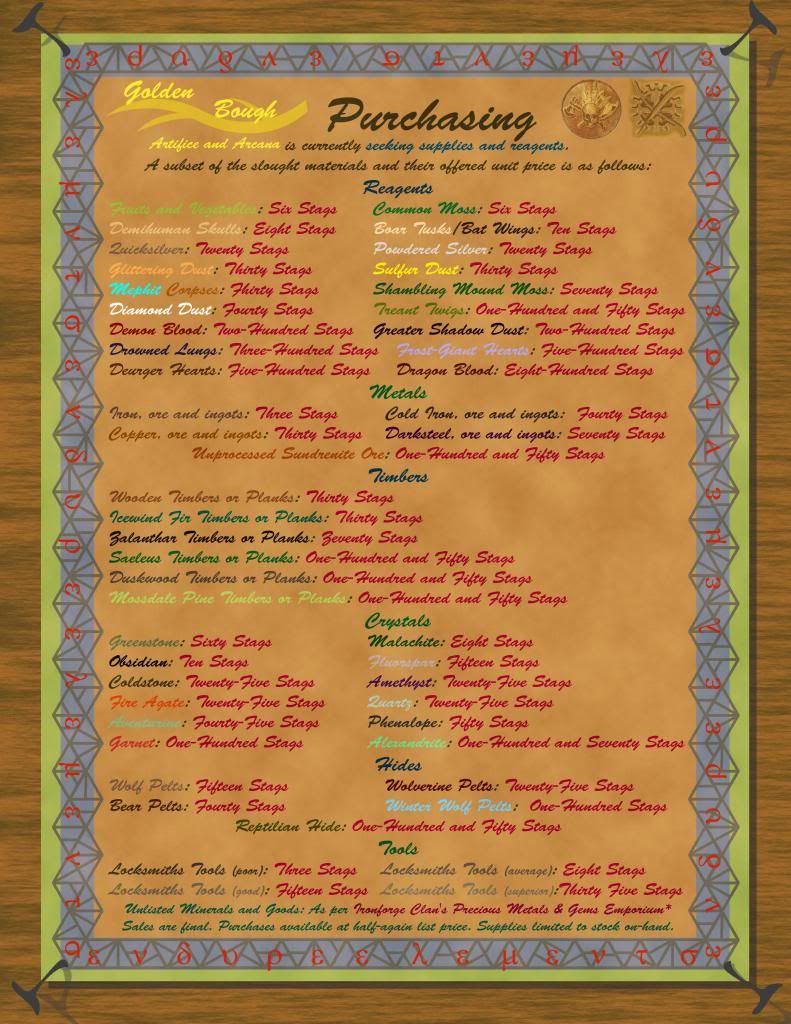 Golden Bough Artifice and Arcana is proud to offer Spellcasting Services, to those discerning individuals in need of arcane aid! Pricing may vary, depending on quantity purchased and intended use, but starts at 20 stags per page of complexity (20 stags/level), plus costs for exotic components. At current, Spellcasting Services are restricted to individuals with Sundren Citizenship or Merchant Papers only.