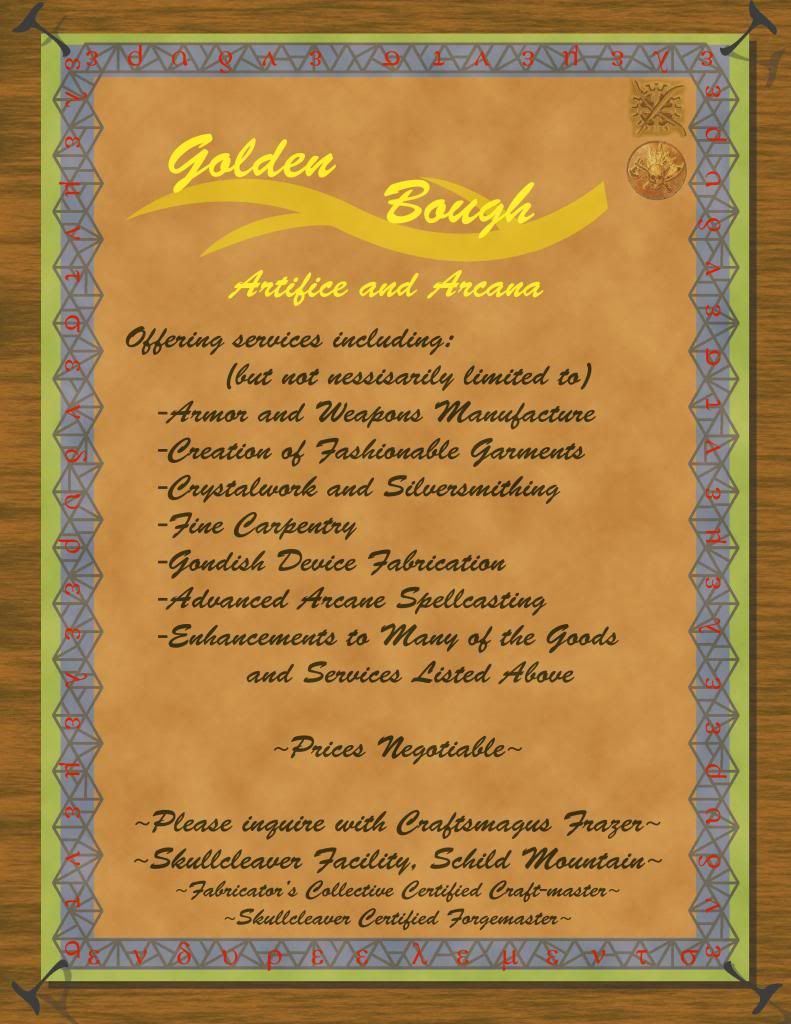 Golden Bough Artifice and Arcana is currently seeking Tinkers and Arcanists interested in Assistant Production and Research And Development! Interested parties must possess Current Sundren Identification, an understanding of Physical and Arcane Sciences, and an Insatiable Curiosity. Projected Benefits to include Answers to Universal Mysteries, Sponsorship in both Goods and Currency, and a Forum of Like-minded Individuals! If interested, please contact directly to setup an interview, or locate your nearest Fabricator's Collective member!